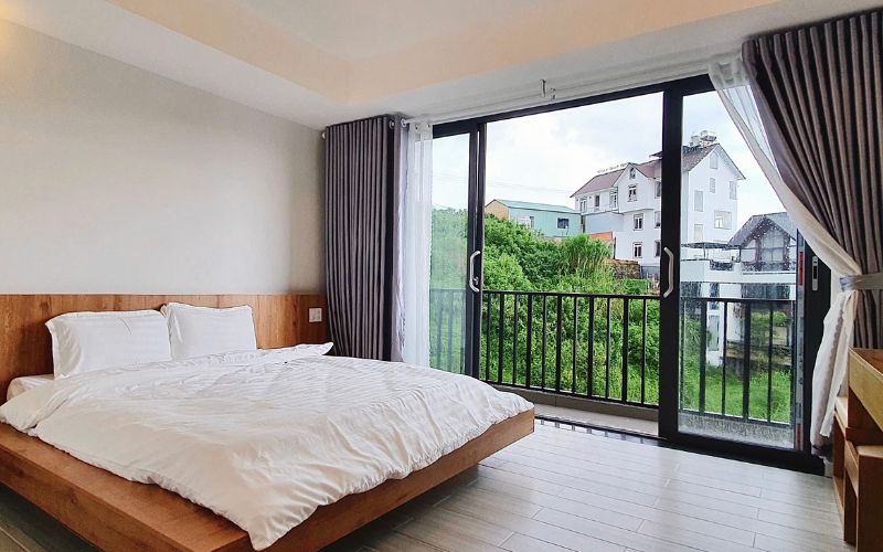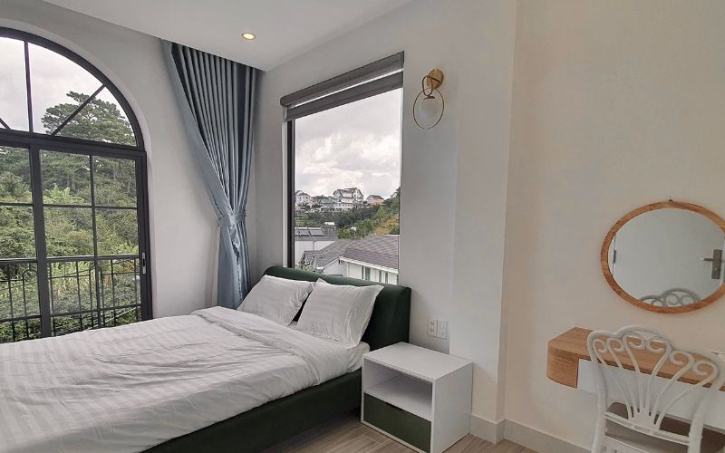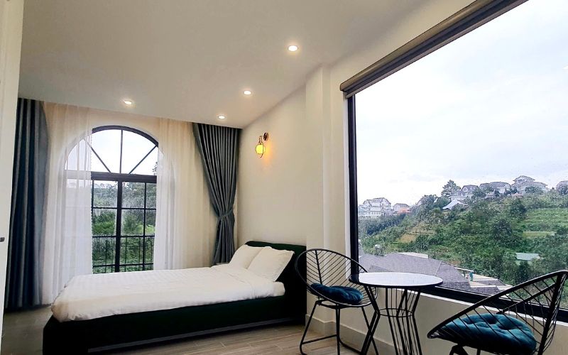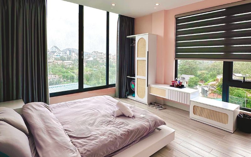 Thức dậy trong căn phòng Superior với tầm nhìn panorama bao quát toàn thung lũng xanh thẫm cùng view săn mây mộng mơ. Phòng có gam màu hồng mộng mơ cho Đà Lạt càng thêm mơ mộng.